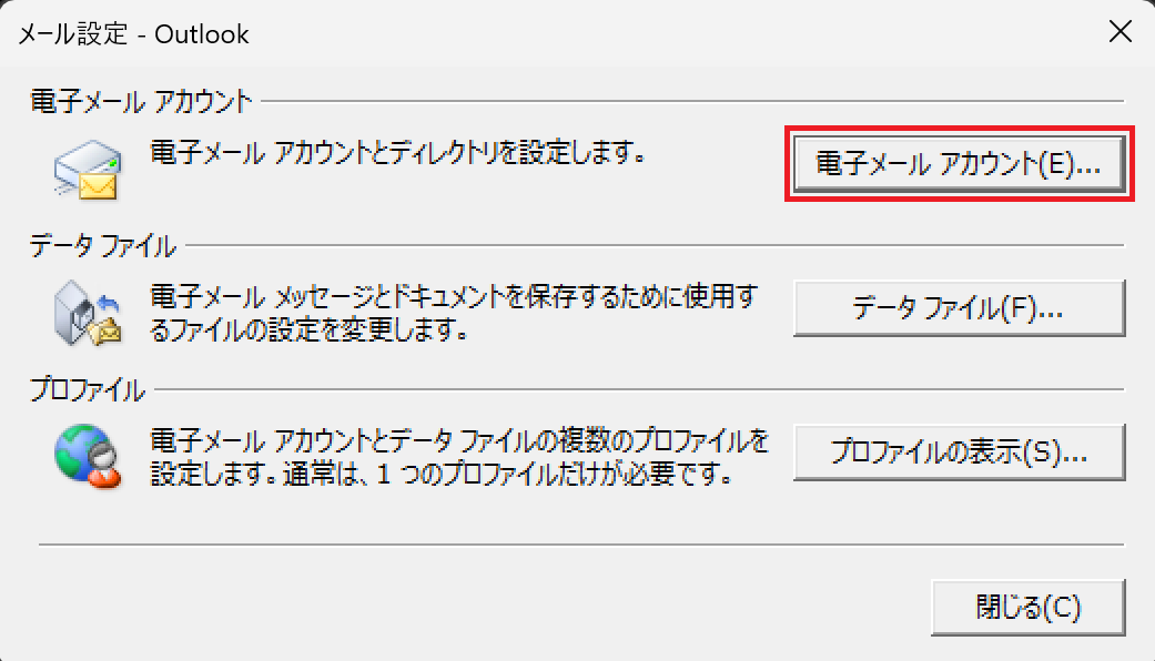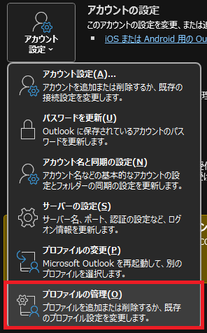 - 「ファイル」→「アカウント設定」→「プロファイルの管理」を選択します。