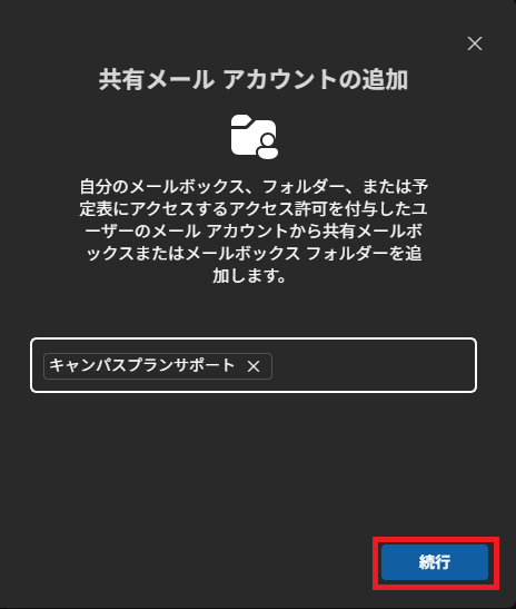 - 「共有フォルダーまたはメールボックスの追加」をクリックします。