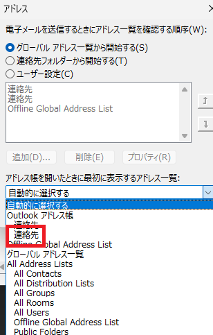 - 「アドレス帳を開いたときに最初に表示するアドレス一覧」で「連絡先」を選択します。